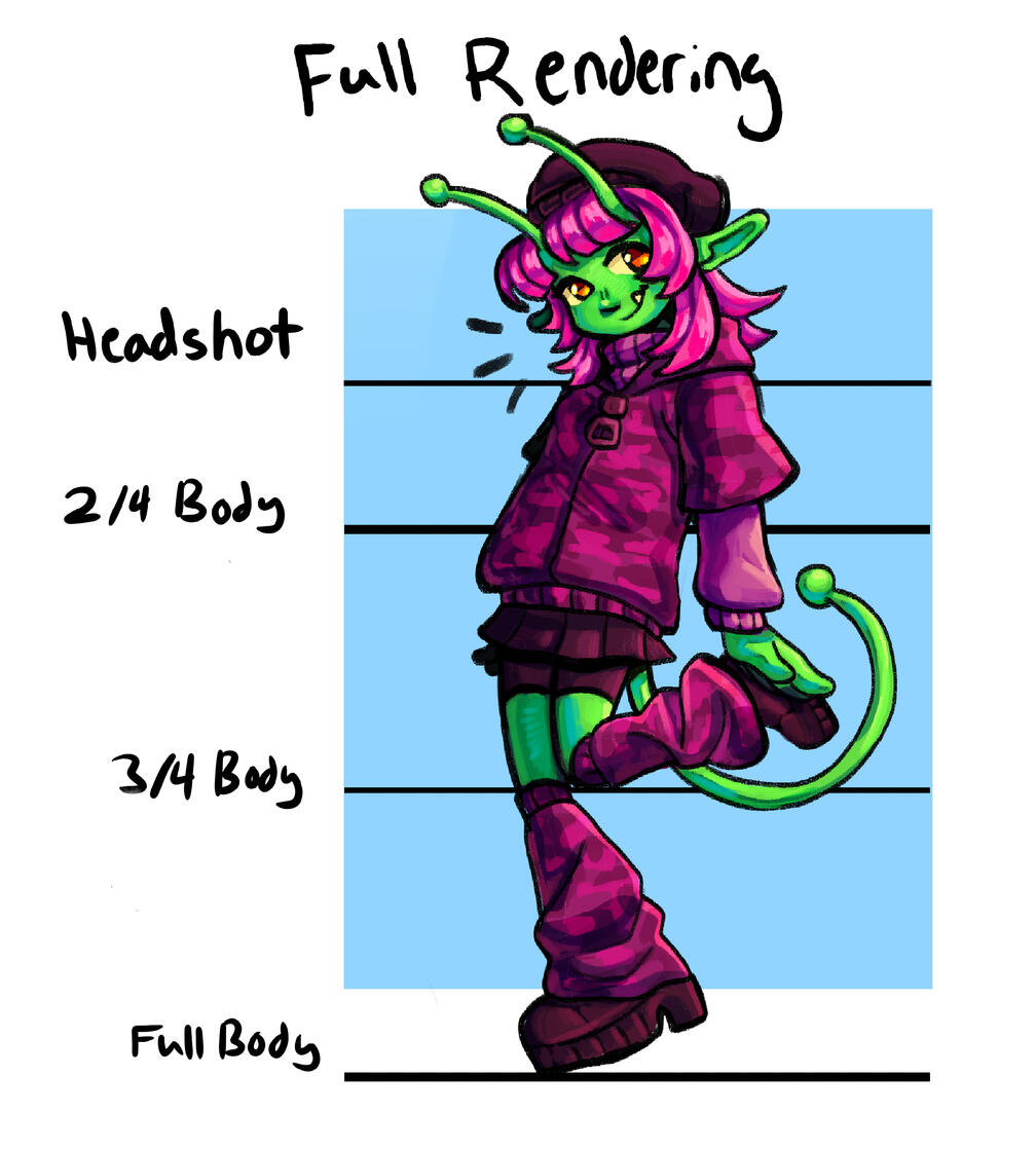 +$10 for me to design your character with no character reference*Character sheets are not fully rendered, they are cell shaded with simple lighting
